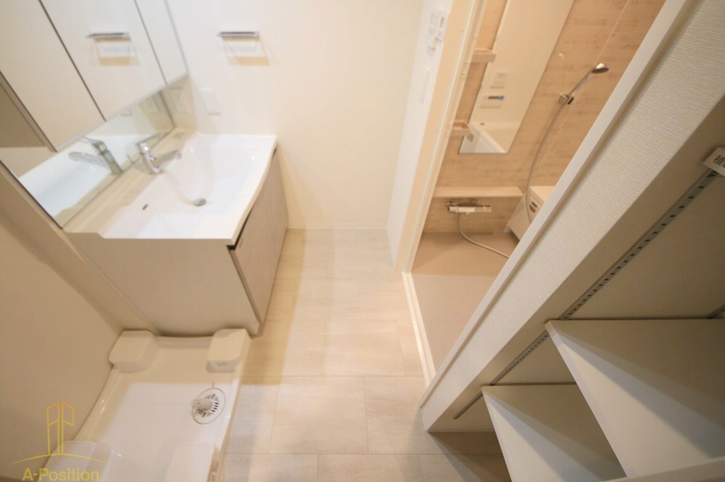 横には可動棚の収納スペースも備え、タオルや洗剤のストックもスマートに管理可能。