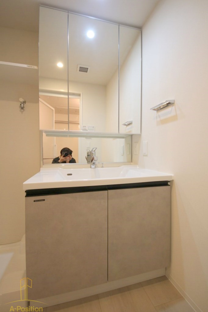 三面鏡付きの洗面台は、朝の身支度にも便利。