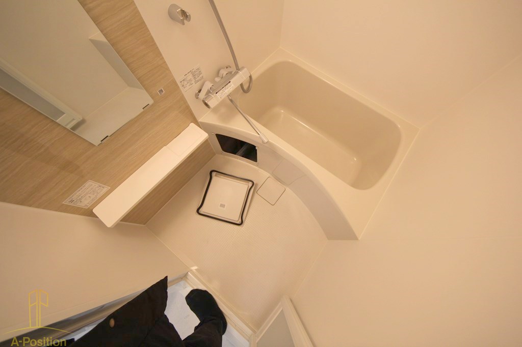 浴槽はゆったりと足を伸ばせるサイズ感。お湯に浸かれば、仕事や勉強の疲れもすっとほぐれていきます。さらにシャワー設備も完備されており、忙しい朝の身支度もスムーズ。