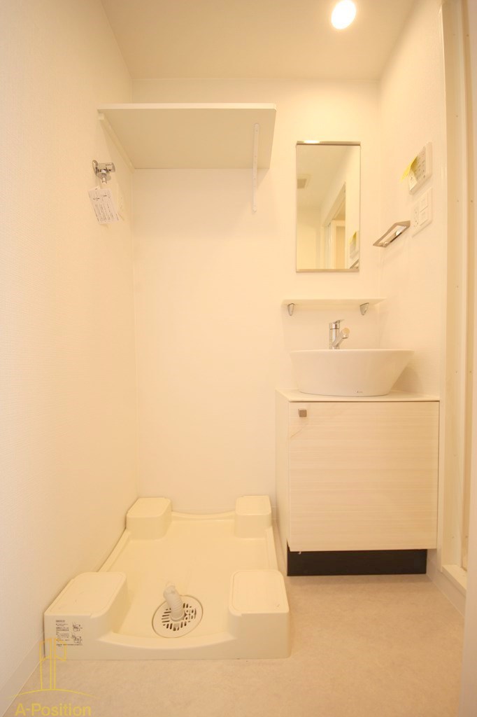 洗面台はコンパクトながらも機能的なデザイン。シンプルなボウル型の洗面ボウルと、スタイリッシュなミラーが備え付けられ、朝の身支度や夜のスキンケアも快適に行えます。さらに下部には収納スペースがあり、ドライヤーや日用品をすっきり収めることが可能。