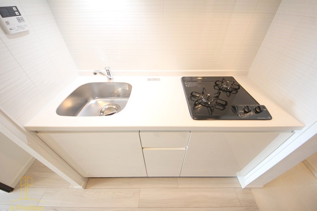 コンロは2口タイプで、炒め物をしながらスープを温めるなど、同時調理が可能。忙しい朝でも効率よく食事の準備ができ、自炊派の方には心強い設備です。さらに、広めのシンクは洗い物もしやすく、調理器具や食器をスムーズに片付けられます。