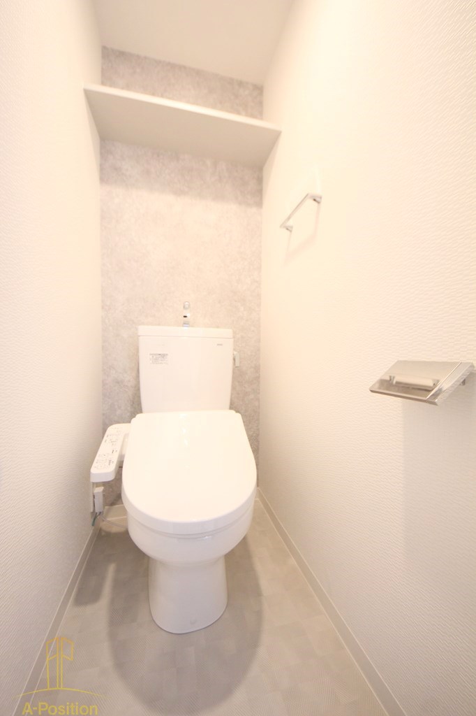 温水洗浄便座付きで、使い心地も快適。寒い季節でも安心して過ごせるのは嬉しいポイントです。さらに、上部には収納棚が備わっており、トイレットペーパーや掃除用品をすっきり整理整頓可能。生活感を見せずに、いつでも清潔な空間を保てます。