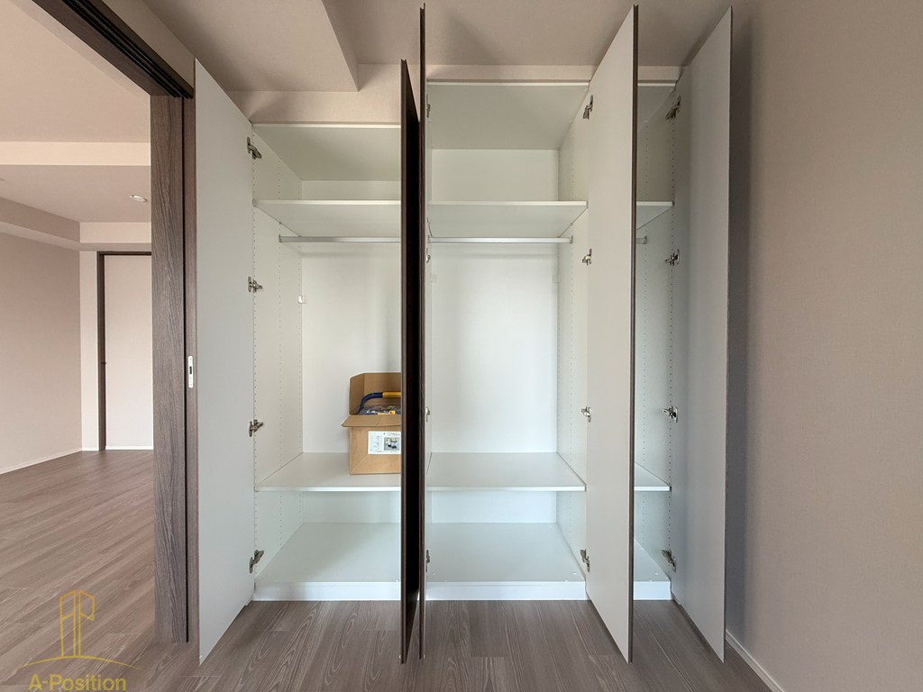 お部屋の壁一面を使った大きなクローゼットは、収納力抜群でお部屋をすっきりと保てます。衣類だけでなく、季節家電やスーツケースなどもすっきり収納できるので、生活スペースを広く使うことが可能です。