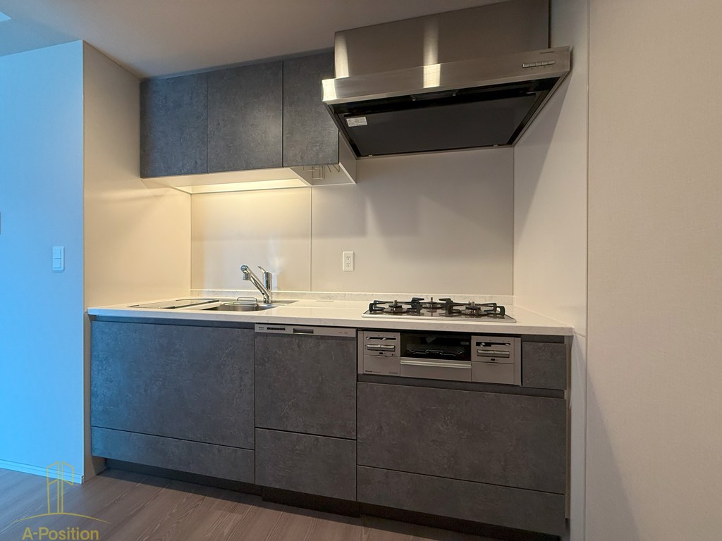 このマンションのキッチンは、スタイリッシュなシステムキッチンを採用。収納スペースも豊富で、調理器具や食器をすっきり整理できるのが嬉しいポイントです。