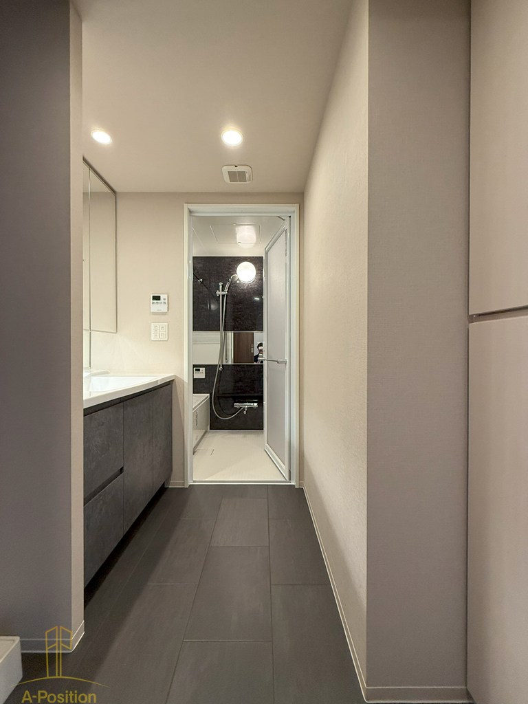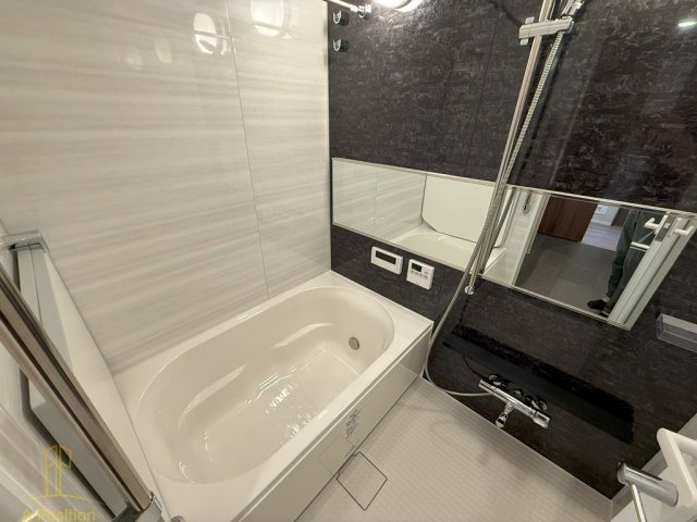 ブラックを基調とした広々とした浴室は、まるで高級ホテルのような雰囲気です。落ち着いた色合いがリラックス感を演出し、1日の疲れをゆったりと癒してくれます。ゆったりとしたバスタブで、長時間の入浴も快適に楽しめるのが嬉しいポイントです。