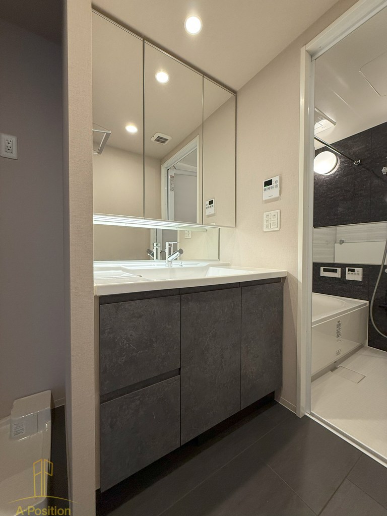 脱衣所に設置された三面鏡は、朝の身支度やヘアスタイルの確認にとても便利です。左右の鏡を角度調整できるので、横顔や後ろ姿も簡単にチェックできるのが魅力。鏡の下には収納スペースもあり、化粧品やスキンケア用品をすっきり整理できるため、脱衣所全体がいつも清潔で使いやすい空間になっています。