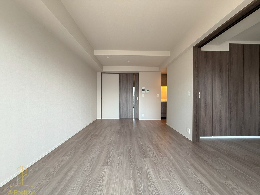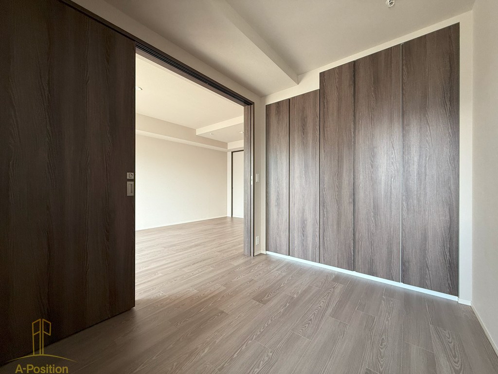 扉を開けると奥行きのある棚やハンガーポールが効率よく配置されており、整理整頓もしやすく、毎日の生活が快適になります。シンプルな洋室でも、この一面クローゼットがあることで、部屋全体の印象がぐっと整い、広さをより感じられる空間になります。