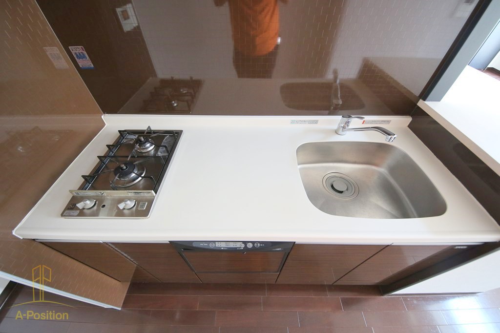2口ガスコンロに広めのワークトップ、シンクもゆったりサイズやから、自炊派の方にもぴったり。料理から片付けまでスムーズにこなせる環境が整っています。