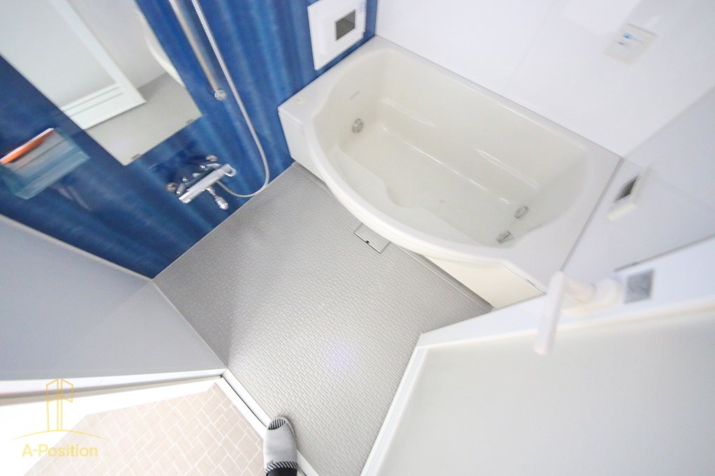 アクセントパネルのブルーが爽やかで清潔感もあり、リラックスしながら過ごせる空間に仕上がっています。浴室乾燥機があれば、雨の日の洗濯にも対応できて実用性もばっちりです。