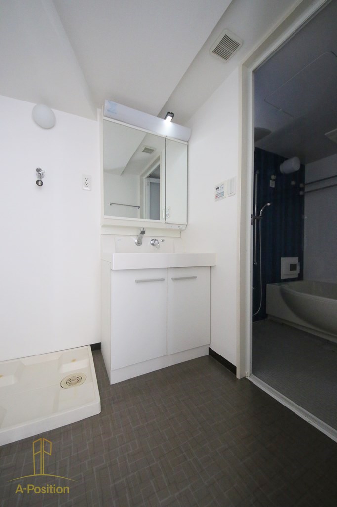 脱衣所には二面鏡タイプの独立洗面台を設置。鏡裏は収納になっているので、洗面道具や日用品をすっきり片付けられます。