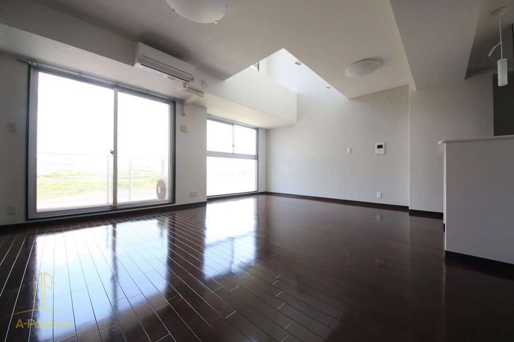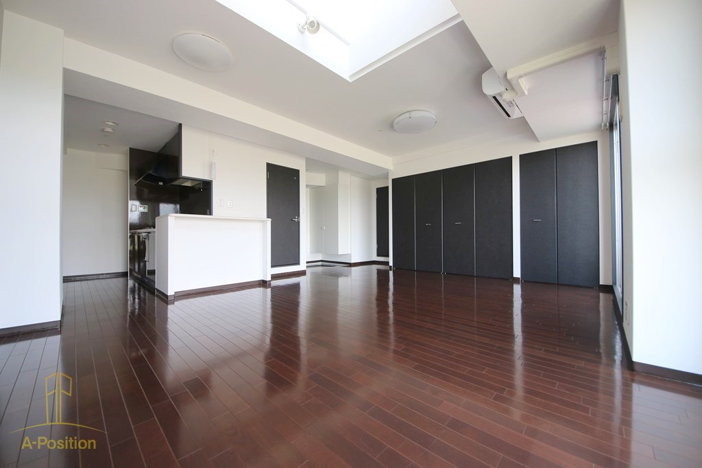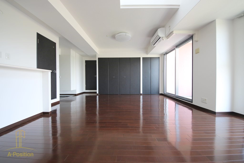 今回ご紹介するのは、約20帖のワンルーム。吹き抜けになった天井と大きな窓からの採光で、実際の広さ以上に開放感を感じられるお部屋です。フローリングや建具は落ち着いた色合いでまとめられていて、シンプルながらも洗練された印象になっています。
