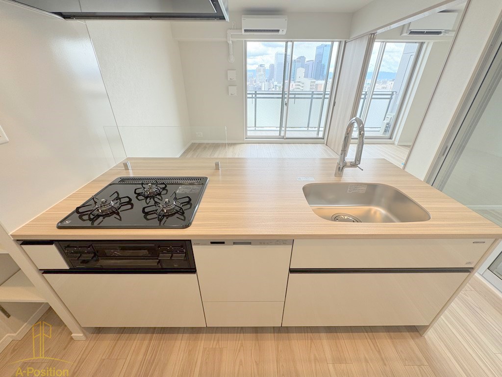 3口コンロ付きで同時調理もしやすく、グリルも備わっているので料理の幅が広がります。さらに 食洗器付き なので、後片付けの手間を大幅に減らせるのも大きな魅力。忙しい日々の中でもスッキリ清潔に保てます。