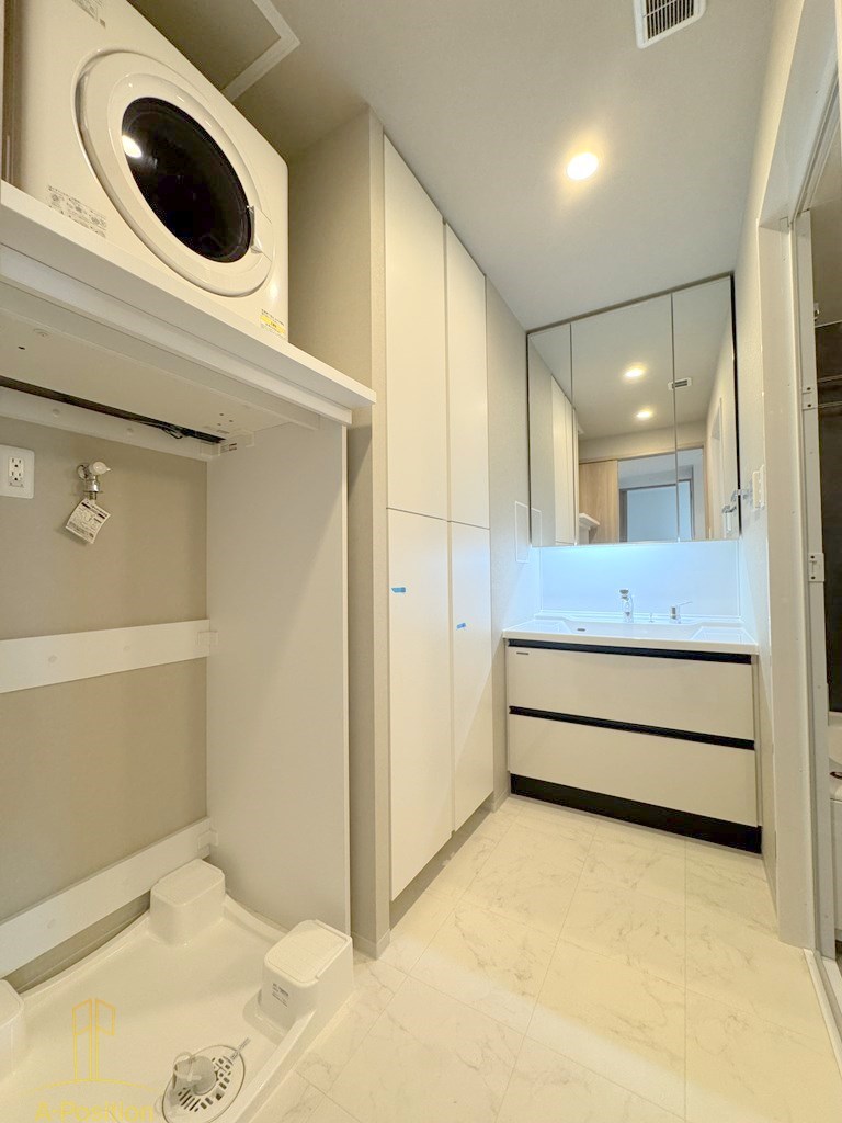 洗濯機置き場の上には乾燥機が設置できるスペースもあり、家事効率を考えた実用的なレイアウト。さらに大型の収納棚も備わっているため、タオルや洗剤、日用品までまとめて収納可能です。