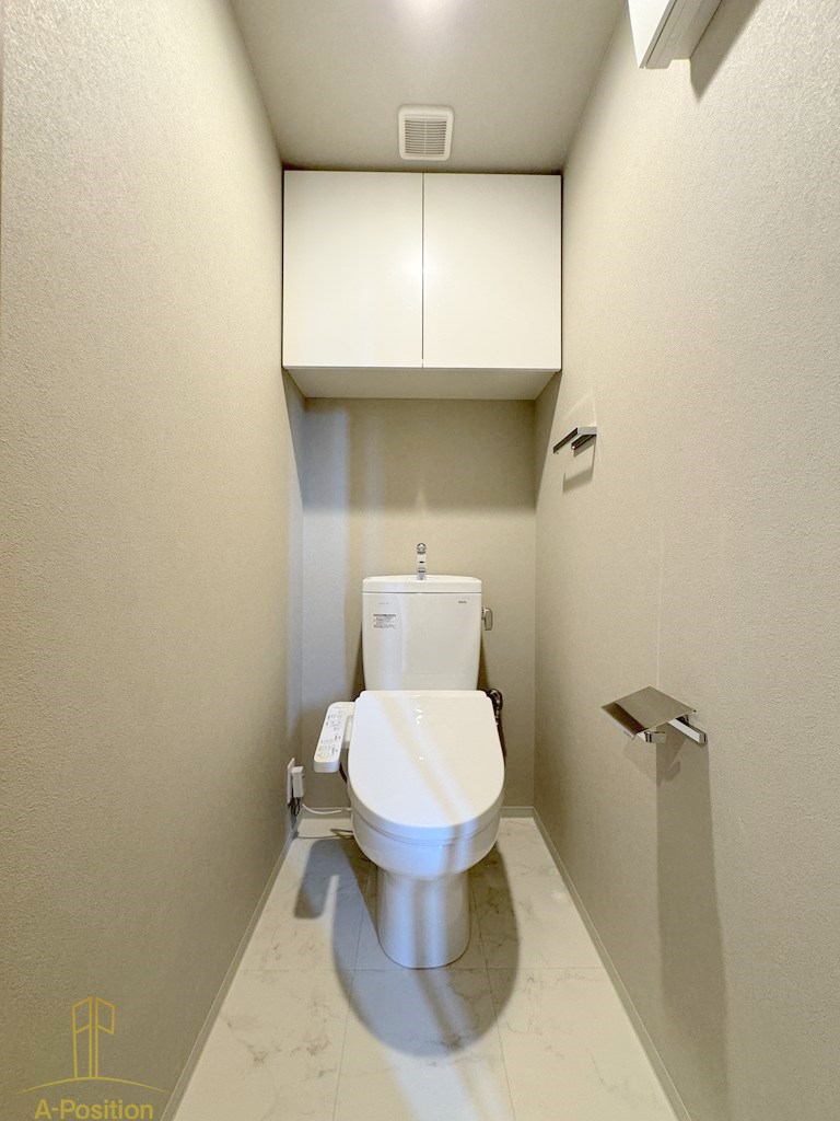 上部には収納棚が備え付けられており、トイレットペーパーや掃除用品などをスッキリ片付けることができます。限られた空間を無駄なく活かした設計で、日常の使いやすさを感じられるのも魅力です。