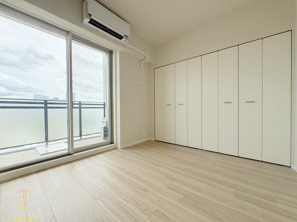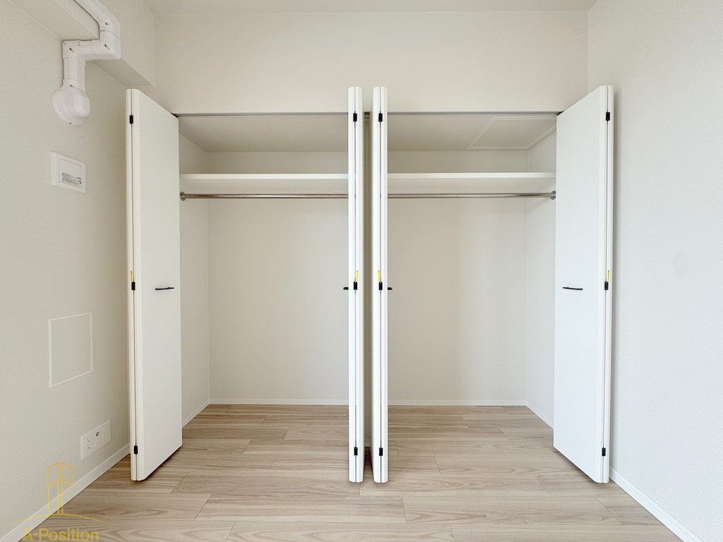 壁一面には大容量のクローゼットを完備。衣類はもちろん、季節の家電や趣味の道具までスッキリ収納できるので、お部屋を広々と使えます。シンプルな空間だからこそ、ベッドルームにもワークスペースにもアレンジしやすく、自分らしい暮らしをデザインできる一部屋です。