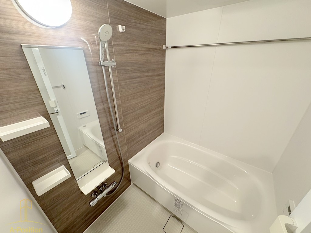 また、大きな鏡と使いやすい棚が備え付けられているので、毎日の入浴がより快適に。清掃性の高い床素材も嬉しいポイントですね。