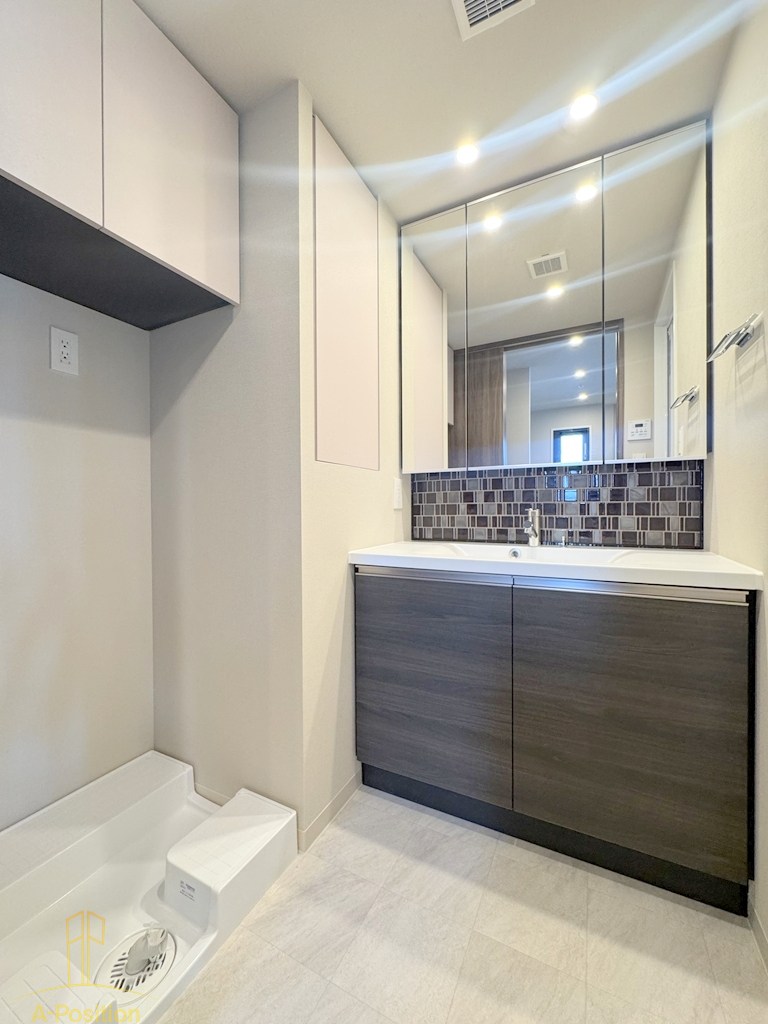 三面鏡付きのワイドな洗面化粧台は、収納力も抜群。鏡の裏には日用品をすっきりと収めることができ、毎日の身支度が快適に行えます。モザイクタイル風のアクセントが上品で、洗練された雰囲気を演出。