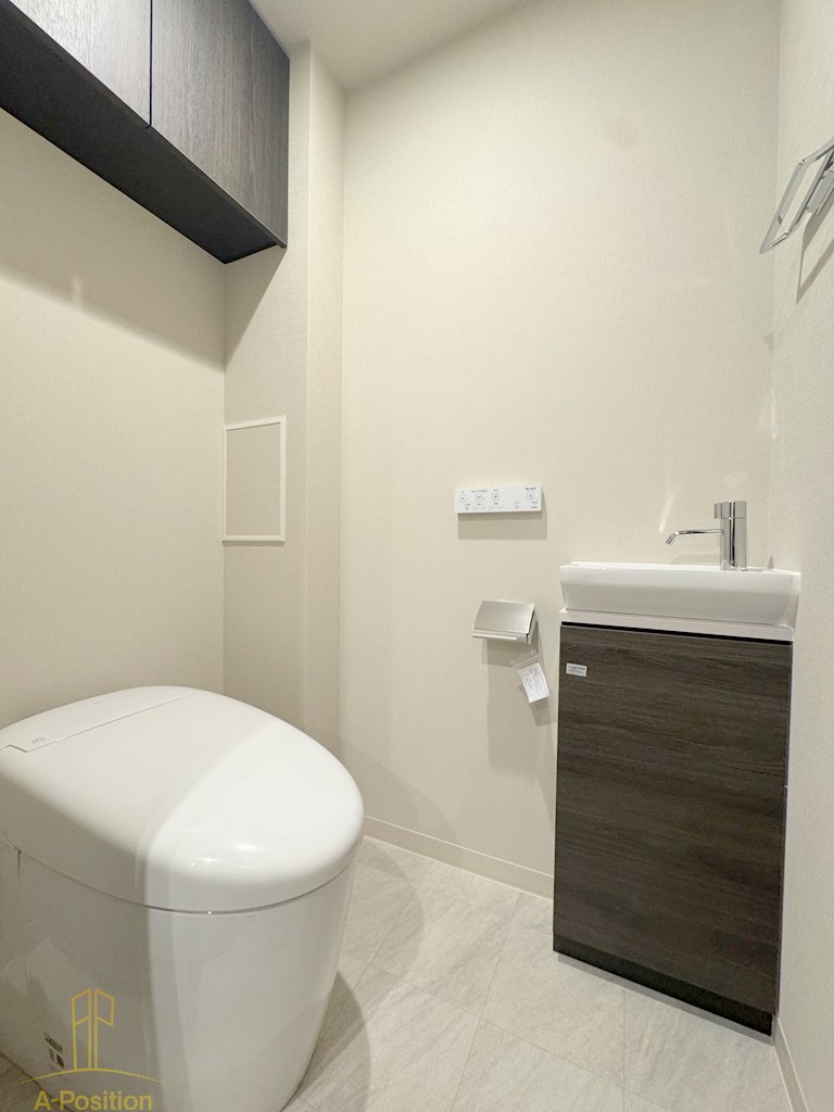 上部収納にはトイレットペーパーや掃除用品などをすっきり収納でき、生活感を抑えたスマートな空間が実現。壁リモコンもすっきりと配置されており、機能性と美しさを両立しています。