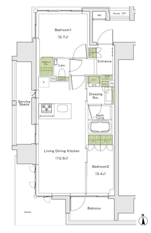 玄関を入るとすぐに「Dressing Room(脱衣所)」と浴室があり、帰宅後すぐにシャワーを浴びられる理想的なレイアウト。リネン収納やシューズクローゼットも完備されており、収納力も抜群です。