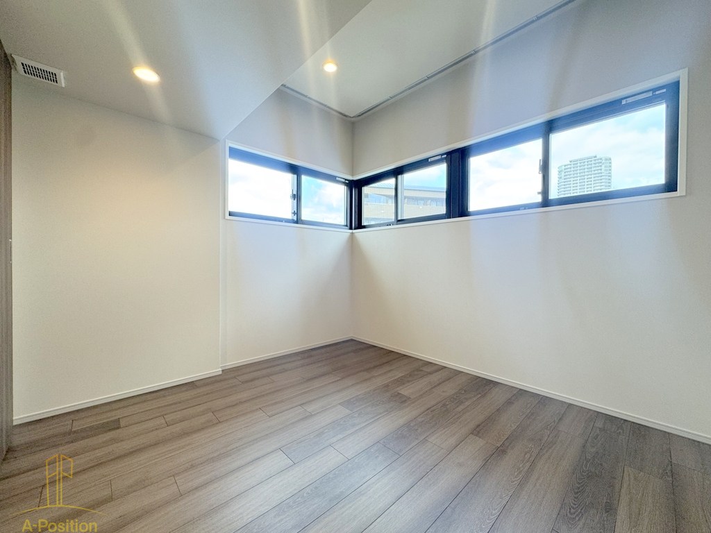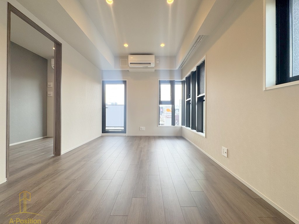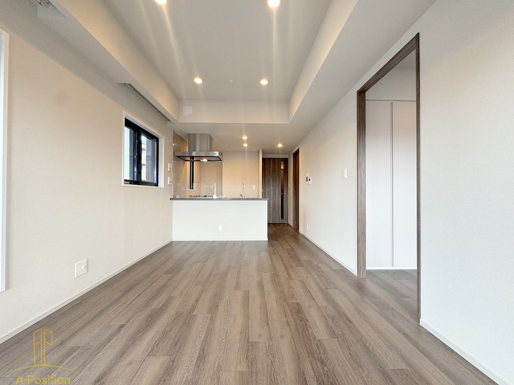 天井のダウンライトが空間を柔らかく照らし、落ち着きのあるフローリングが全体の雰囲気を引き締めています。南向きの大きな窓からたっぷりと自然光が入り、日中は照明いらずの明るさ。角部屋ならではの2面採光で、開放感も抜群です。