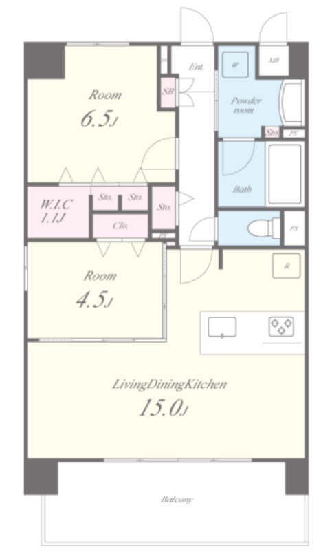 洋室は 6.5帖と4.5帖 の2部屋。主寝室や子ども部屋、書斎などライフスタイルに合わせて使い分けできます。特に6.5帖の洋室には ウォークインクローゼット が付いており、収納力もたっぷり。
