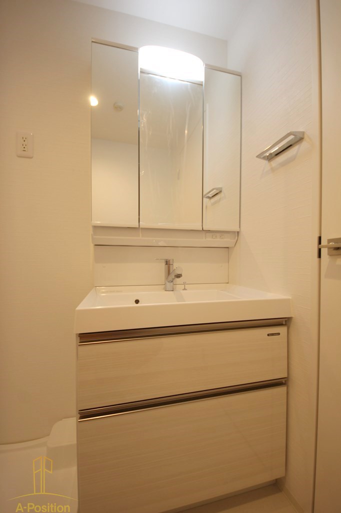 脱衣所は白を基調とした清潔感のある空間で、毎日の身支度が気持ちよくなるデザインです。三面鏡付きの洗面台は、角度を変えて全身のチェックができるので、忙しい朝でも便利に使えます。収納スペースも十分に確保されており、タオルや小物もすっきり整理可能。明るく開放的な印象で、清潔さと使いやすさを両立した設計になっています。毎日使う場所だからこそ、細部までこだわった造りが嬉しいポイントです。