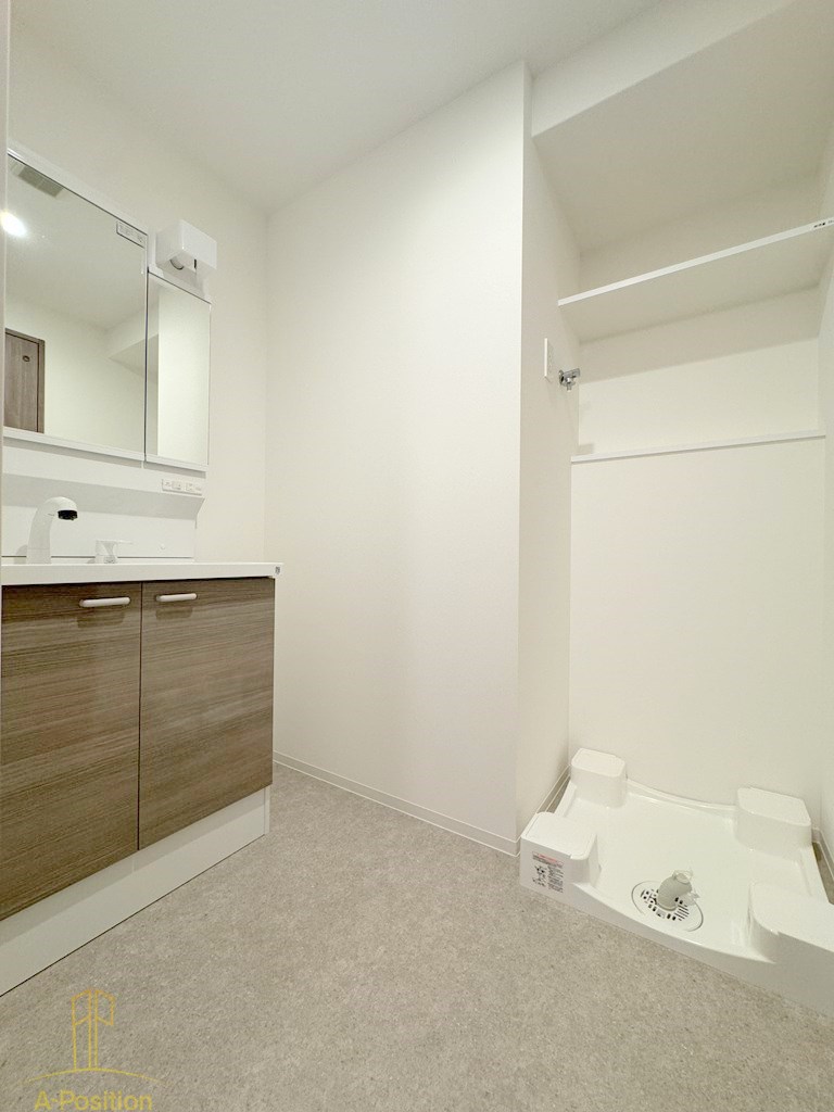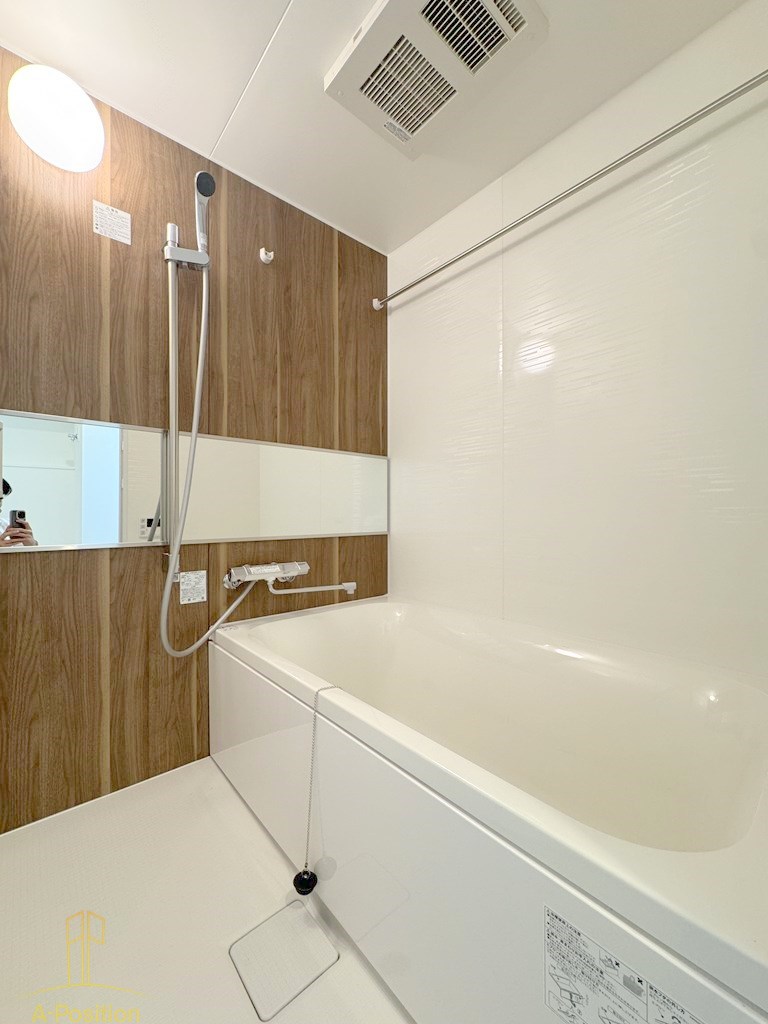 木目調の洗面化粧台がアクセントとなり、空間に自然な温もりをプラスしています。