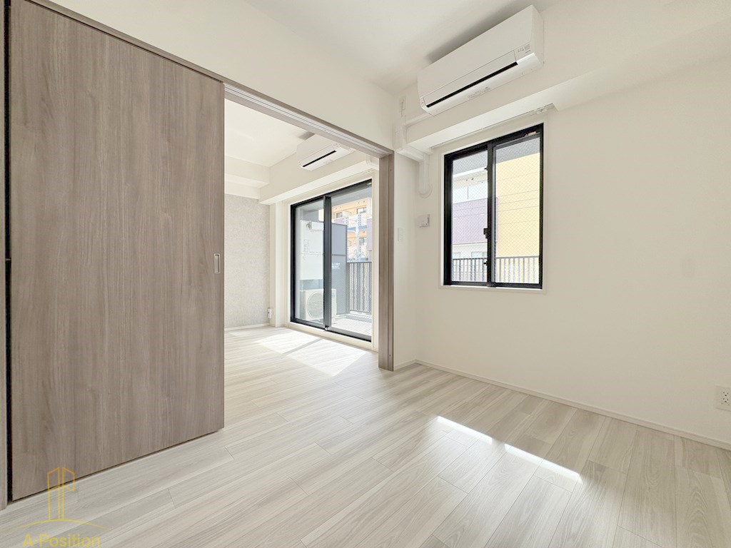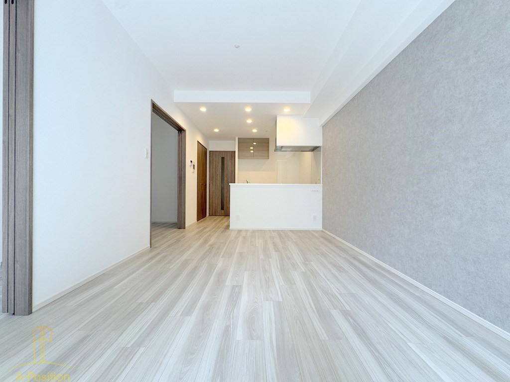淡いグレートーンのフローリングと、アクセントクロスが落ち着いた印象を与え、