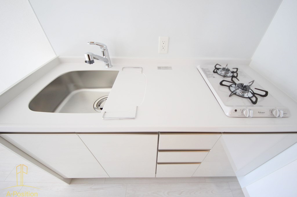 ワークトップからシンク、コンロまで無駄のない一直線のデザインで、料理のしやすさと見た目の美しさを両立しています。ステンレスシンクは深さがあり、洗い物もラクラク。コンロは2口ガス仕様で、同時調理もスムーズにこなせます。