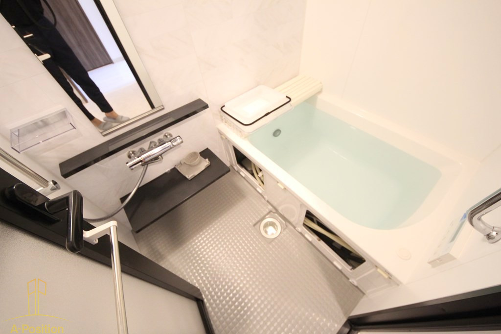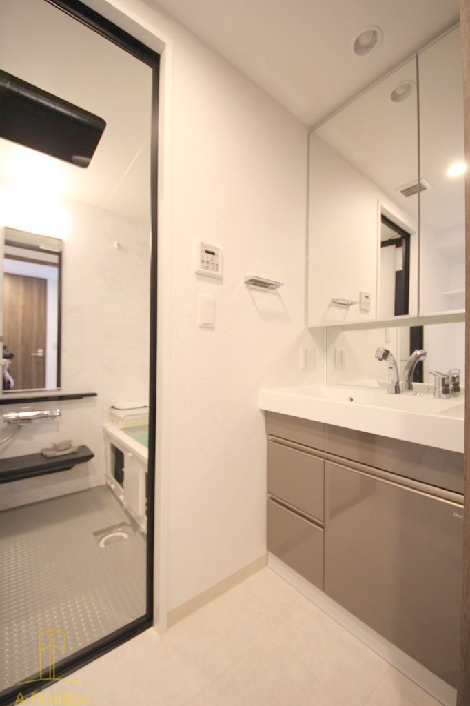 壁面にはワイドミラーと収納棚を設置し、見た目もスッキリ。おしゃれさと実用性のバランスが取れています。さらに浴室乾燥機も完備しており、雨の日の洗濯も快適。滑りにくい床素材で安全性にも配慮されています。