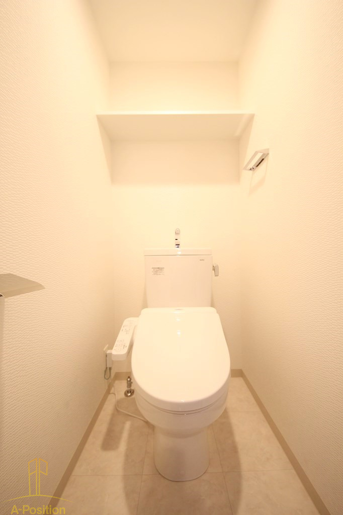 やわらかな照明と淡いカラーのクロスが、圧迫感を感じさせない落ち着いた雰囲気を演出しています。上部には便利な収納棚があり、トイレットペーパーや掃除用品などをすっきり収納可能。見た目もスマートで、生活感を感じさせません。