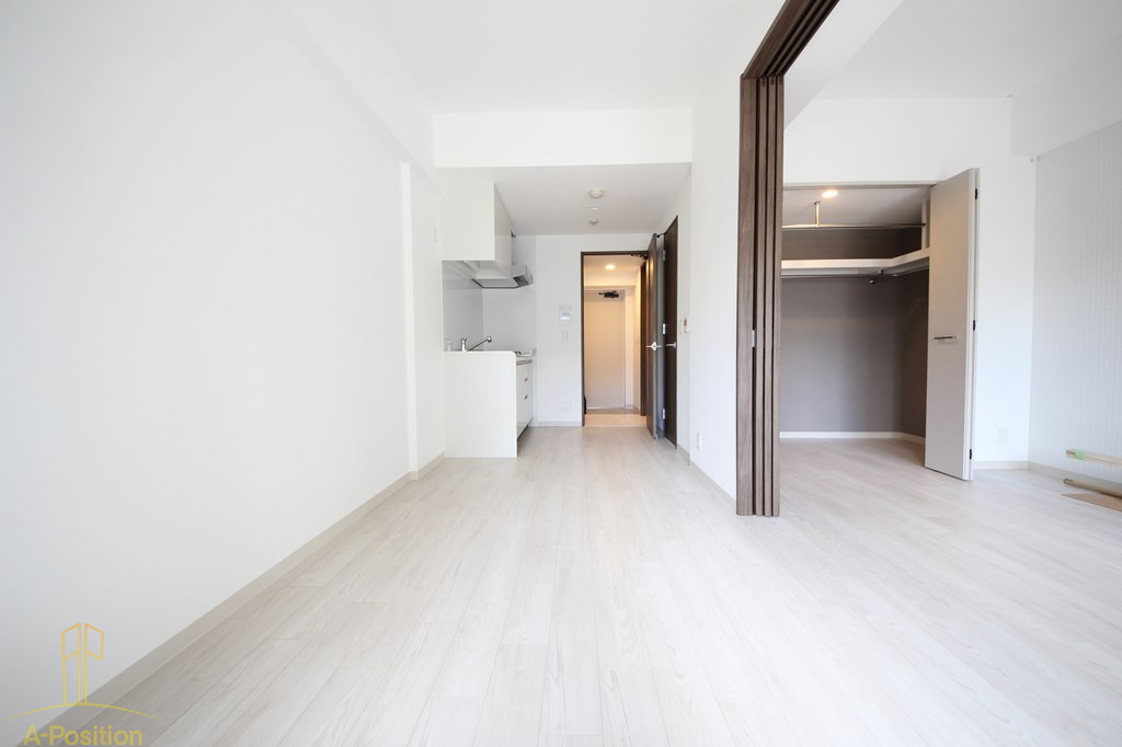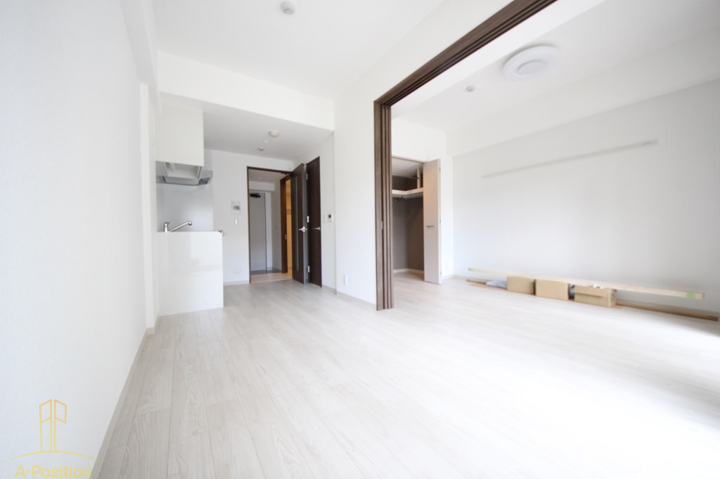 奥にはキッチンがあり、無駄のないスマートなレイアウト。料理をしながらリビングの様子も見渡せるので、ひとり暮らしはもちろん、カップルでの生活にもぴったりです。