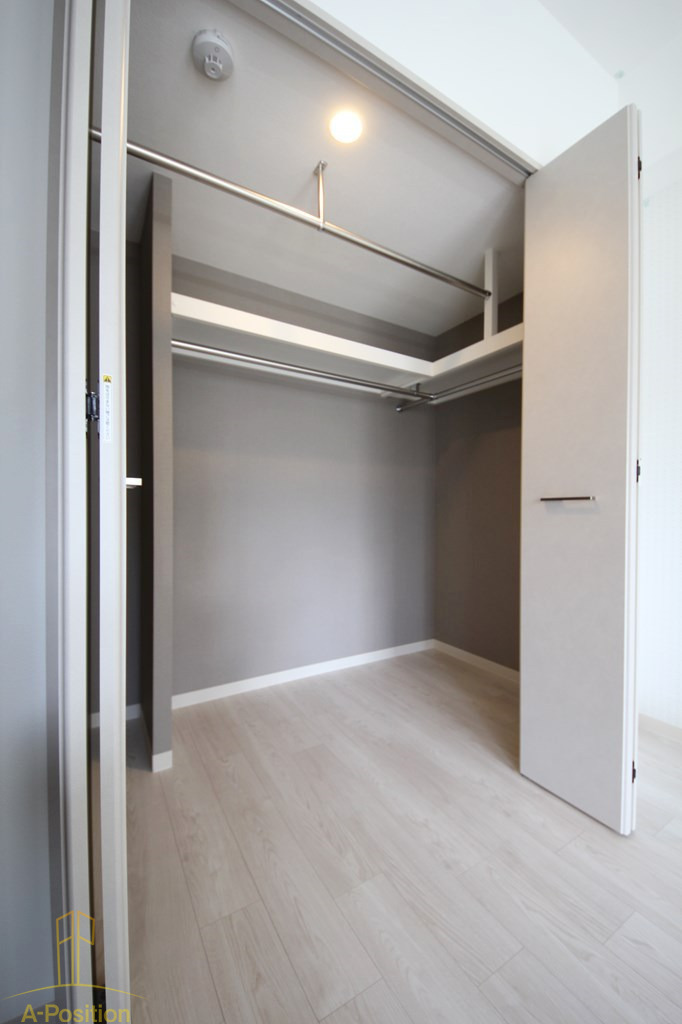 天井には照明が備わっているため、暗くなりがちな収納空間も明るく快適。グレートーンの壁が上品で、まるでショップのフィッティングルームのような雰囲気を演出しています。