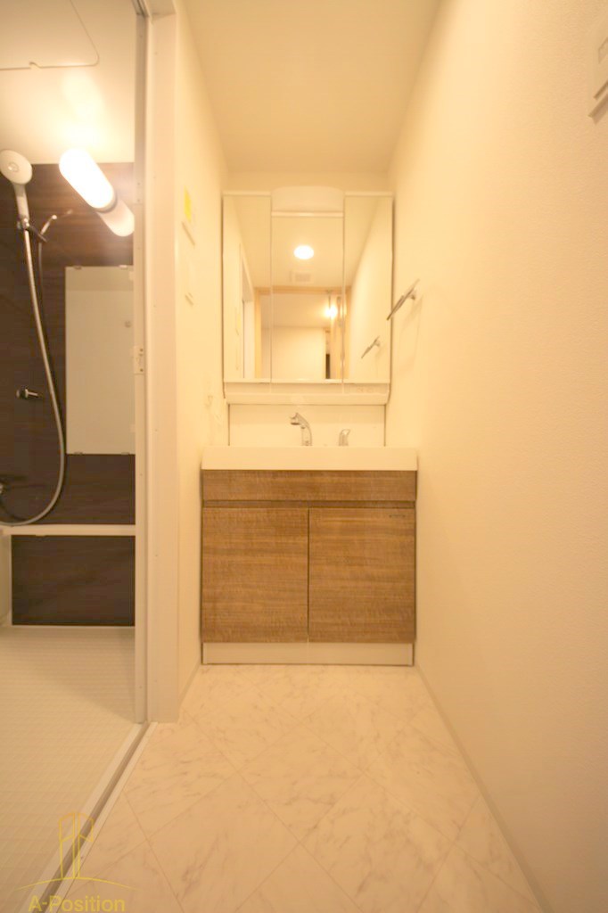 身だしなみに余裕あり:三面鏡のある洗面台なので、髪型チェック・化粧・ひげ剃りなど“鏡前作業”が快適。朝の準備時間をちょっと贅沢にできます。