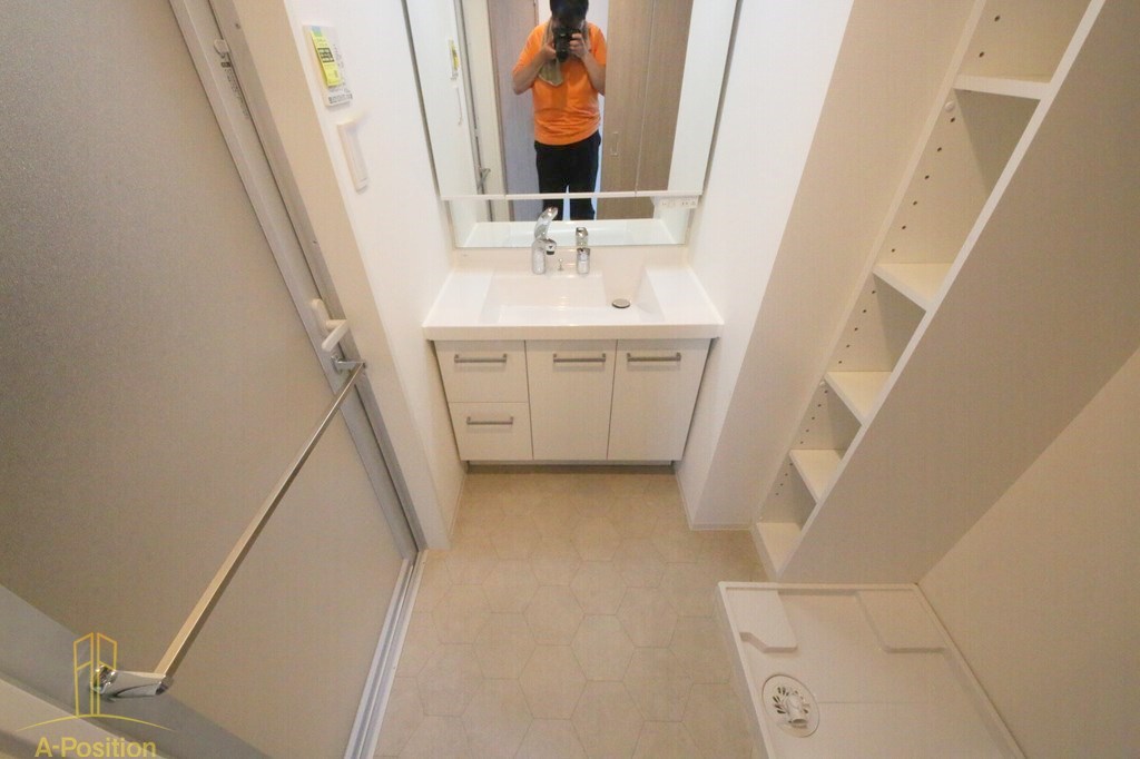 白を基調とした内装に、収納棚や洗面台がすっきりとレイアウトされ、