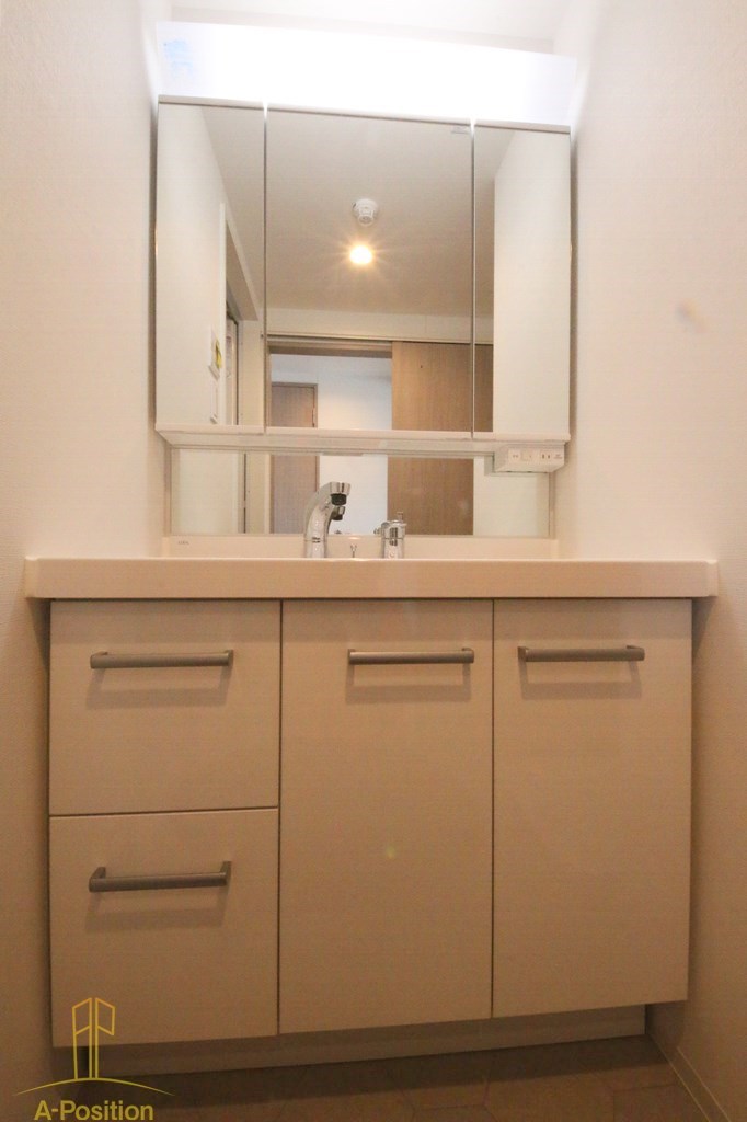 三面鏡タイプの独立洗面台は、鏡裏に収納スペースを確保。