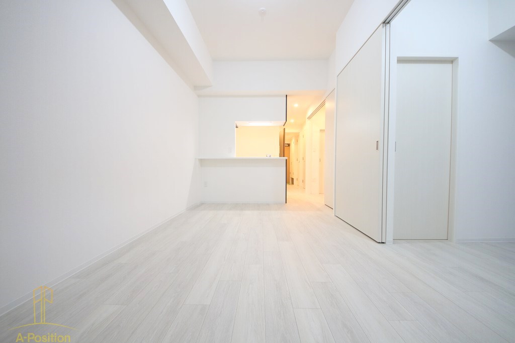 キッチンとの仕切りを感じさせないオープンカウンターが、空間の抜け感を生み出しています。天井も高く、圧迫感のない広がりあるリビング。シンプルながらも、間接照明が温かく包み込むような上質さを感じられるお部屋です。