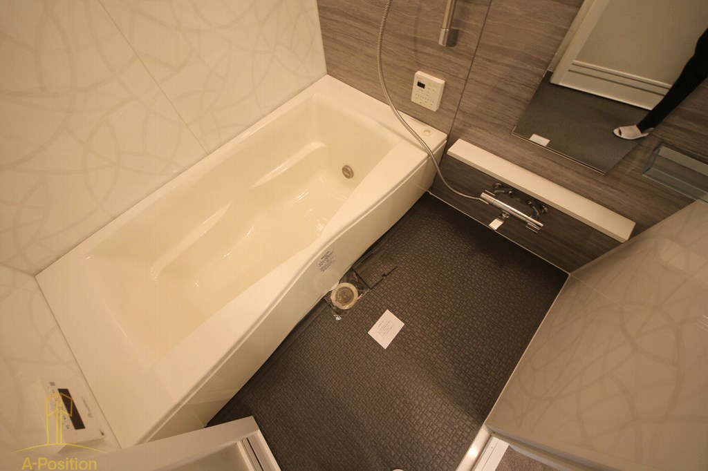 バスルームはホテルライクなデザイン。石目調の壁パネルと美しい曲線の浴槽が高級感を演出しています。追い焚き機能や浴室乾燥機も完備されており、快適なバスタイムをサポート。