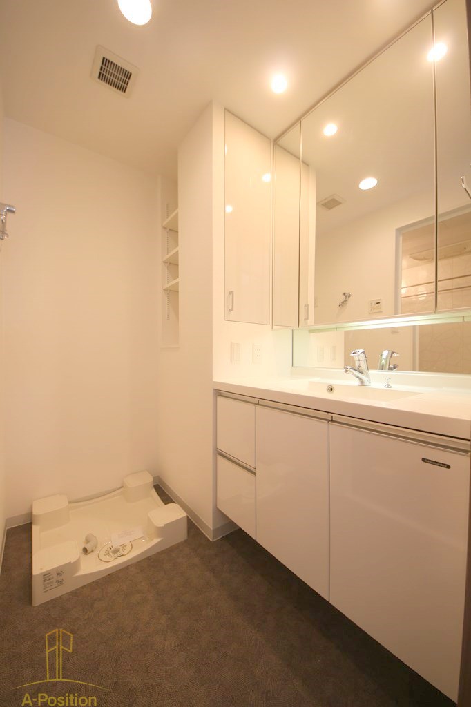 ホワイトを基調とした空間にダウンライトの明かりがやわらかく広がり、朝の支度や夜のスキンケアも快適に過ごせる心地よさがあります。