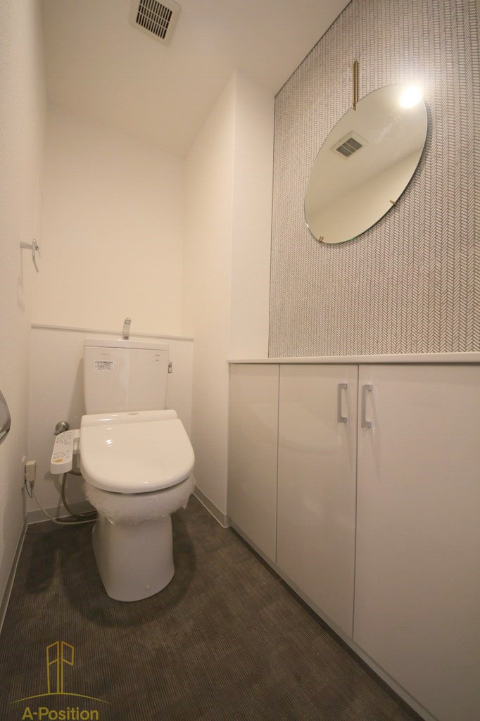 トイレには円形ミラーとアクセントクロスが施され、シンプルながらもデザイン性の高さが光る空間に。