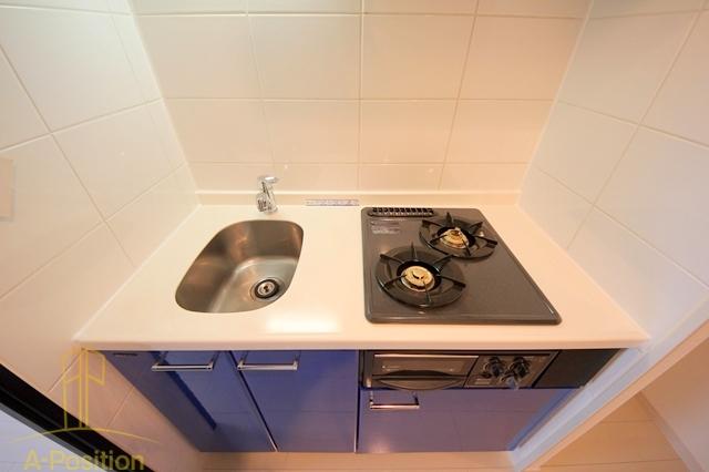 鮮やかなブルーの扉がアクセントになったこちらのキッチンは、見た目の可愛らしさと機能性を両立した一台。2口ガスコンロに加えてグリルまで完備しており、自炊派の方でも満足できる本格的な設備がそろっています。