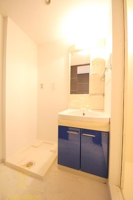 洗濯機置き場がすぐ隣にあり、洗濯動線もバッチリ。清掃性の高いフロア材で、毎日のお手入れがしやすいのも嬉しいポイントです。収納もしっかりあるので、タオルや日用品をまとめて置いてもすっきり。