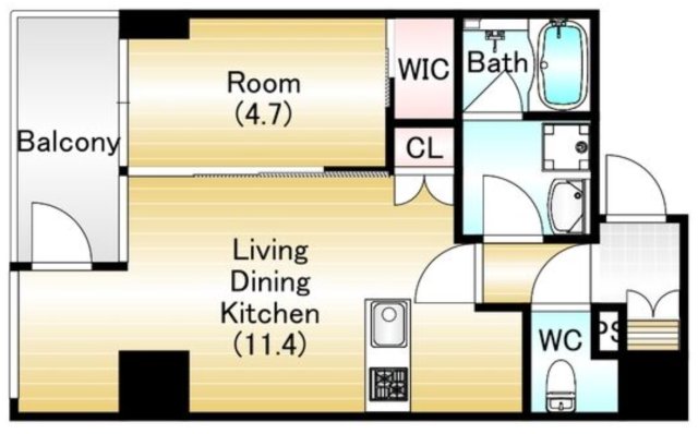 今回のお部屋は、11.4帖の広々としたLDK+4.7帖の洋室を備えた1LDKタイプ
