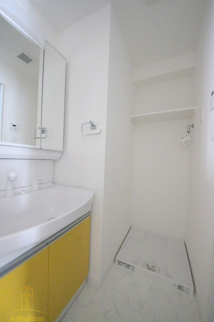 白を基調とした脱衣所は、清潔感が際立つとても気持ちの良い空間。ゆったりとした独立洗面台には、便利な三面鏡収納を備えており、スキンケア用品や細かな日用品もすっきり片付けられます。イエローの扉カラーがアクセントとなり、空間に明るさとかわいらしさをプラスしてくれています。