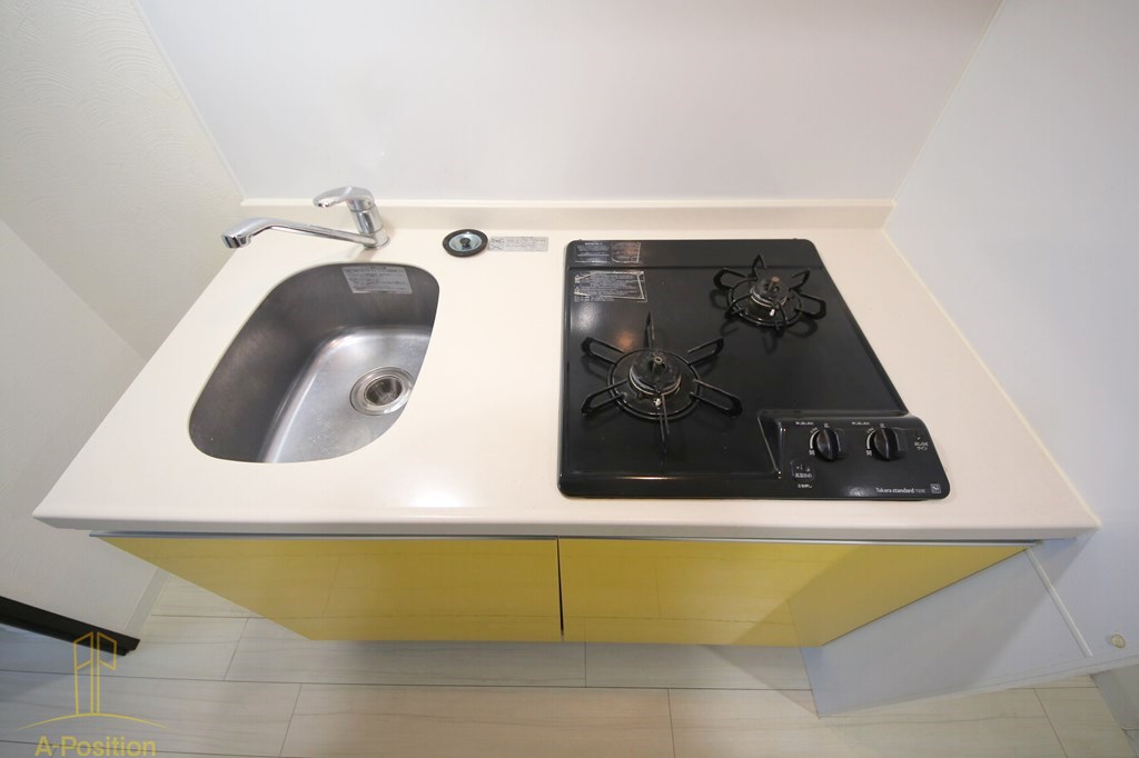 2口ガスコンロを備えているので、同時調理もラクラク。自炊派の方にも安心して使っていただける本格仕様です。シンクは丸みのあるステンレス製で、お手入れがしやすくいつでも清潔さをキープ。