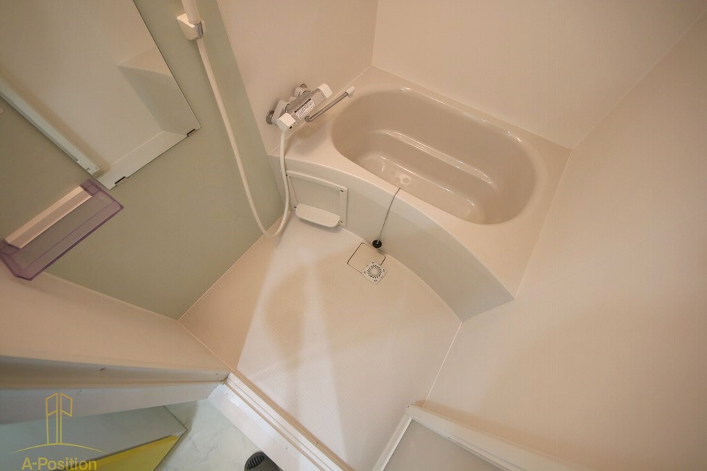 やわらかいベージュトーンでまとめられた清潔感あふれるバスルーム。浴槽は丸みのあるフォルムで、コンパクトながらもしっかり身体を預けてリラックスできる形状になっています。ひとり暮らしの方にはちょうど良いサイズ感で、湯張りも早く経済的なのが嬉しいポイント。