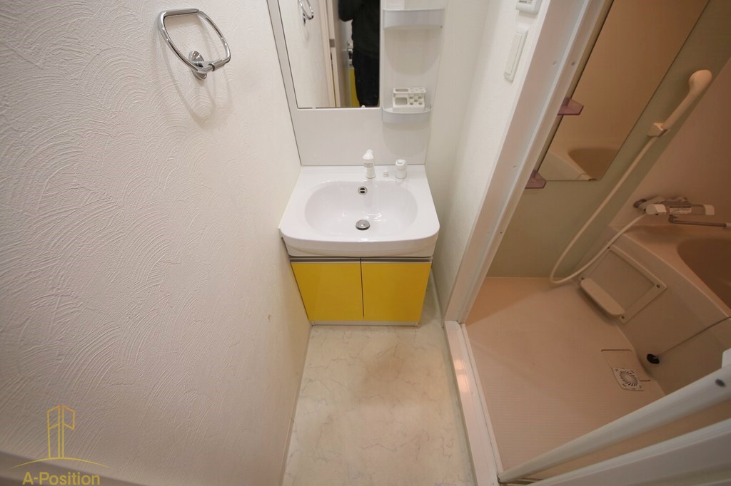 洗面台は、お部屋のアクセントにもなるイエローの扉が可愛らしく、毎日の身支度が少し楽しくなるデザイン。ミラー横には使いやすい小物収納が備わっており、歯ブラシやスキンケア用品をすっきり整理できます。照明の明るさも十分で、メイクや身だしなみチェックもしやすい仕様です。