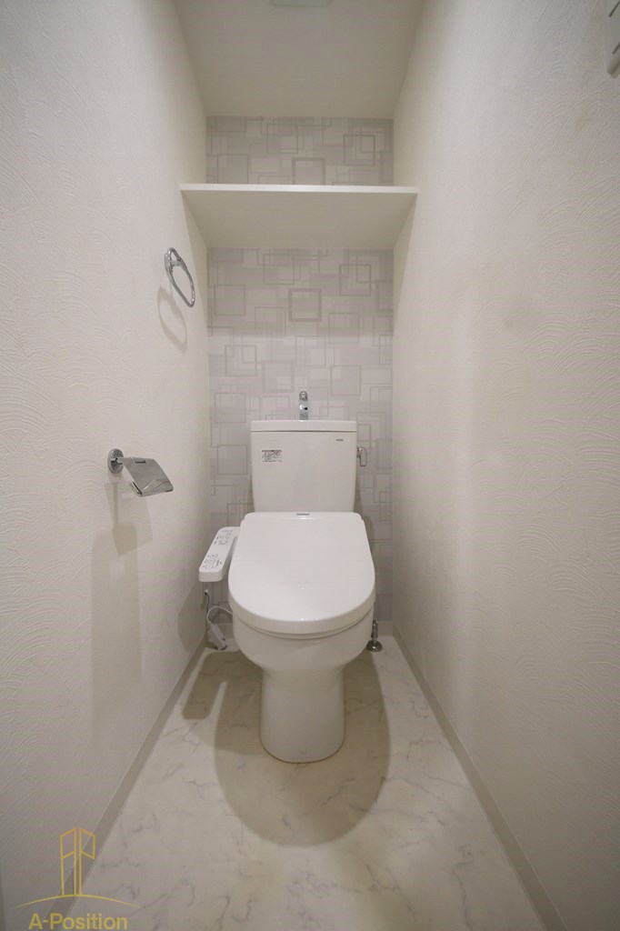さらに、上部には便利な棚が設けられており、トイレットペーパーのストックや小物の収納にも活躍。限られたスペースを上手に活かした、快適で居心地の良いトイレです。