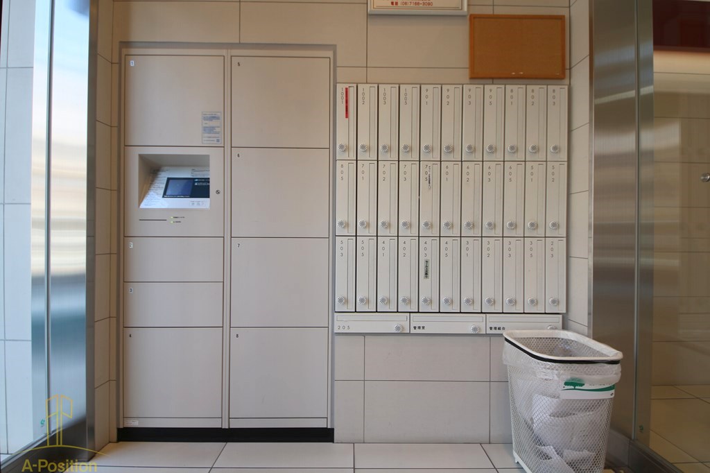 明るく清潔感のあるエントランスには、整然と並ぶメールボックスと大型の宅配ボックスが配置され、住まう方の暮らしやすさをしっかり支えてくれます。