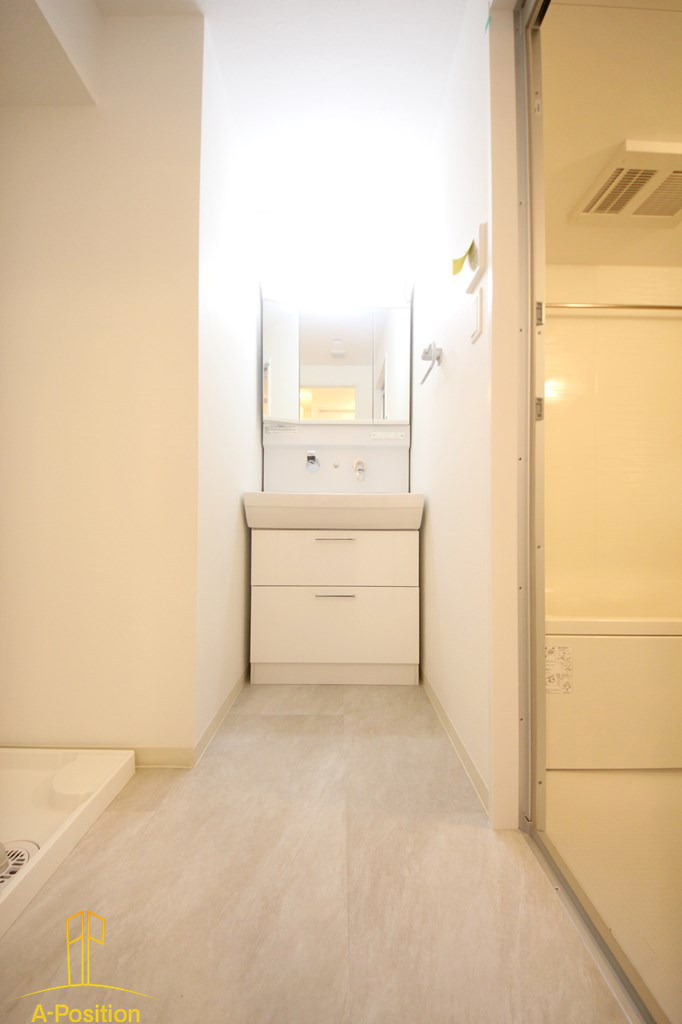 洗面スペース内には洗濯機置場が設けられており、入浴や洗濯の動線がコンパクトにまとまっています。